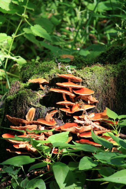 Die Pilze haben sich an einem vermoosten alten abegbrochenen