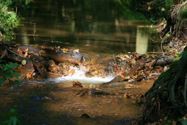 Gleich hinter den Bäumen fließt ein breiter Bach.